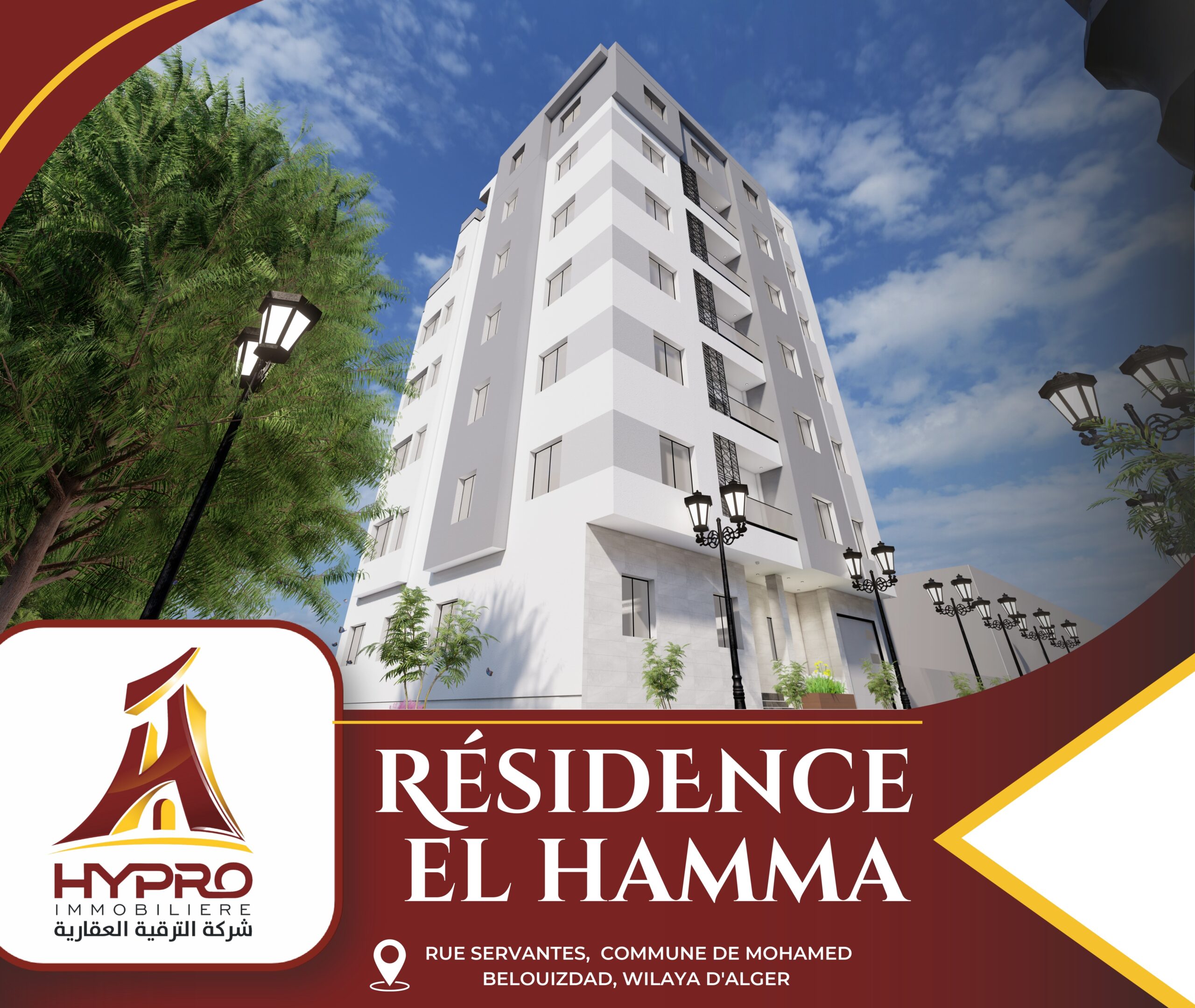 Découvrez la Résidence El Hamma, une adresse prestigieuse située à Rue Servantes, commune de Mohamed Belouizdad, Wilaya d’Alger. Cette résidence moderne propose une gamme variée d’appartements, allant du F2 et F3 en simplex aux spacieuses unités F3 et F5 avec terrasse, offrant des espaces de vie adaptés à tous les besoins.