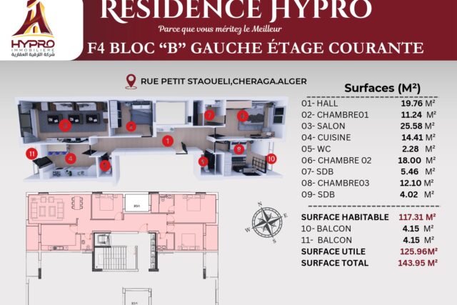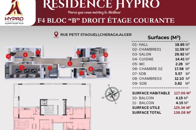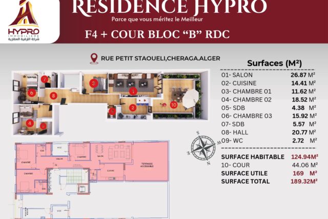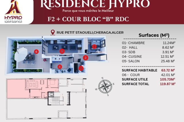 Découvrez une variété d’espaces de vie modernes à la Résidence Hypro, proposant plusieurs configurations d’appartements de 2 à 4 chambres avec des agencements spacieux, des cours privées et des balcons. Offrant une surface habitable allant de 63,72 m² à 124,94 m², ces résidences allient parfaitement confort et praticité, avec des biens conçus aussi bien pour la vie familiale que pour les besoins commerciaux. Chaque unité dispose d’équipements modernes, comprenant plusieurs salles de bains, cuisines, salons et balcons. Située dans le quartier prisé de Petit Staoueli, cette résidence garantit une qualité de vie exceptionnelle.