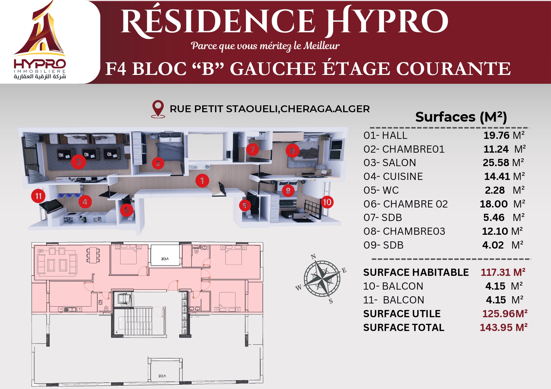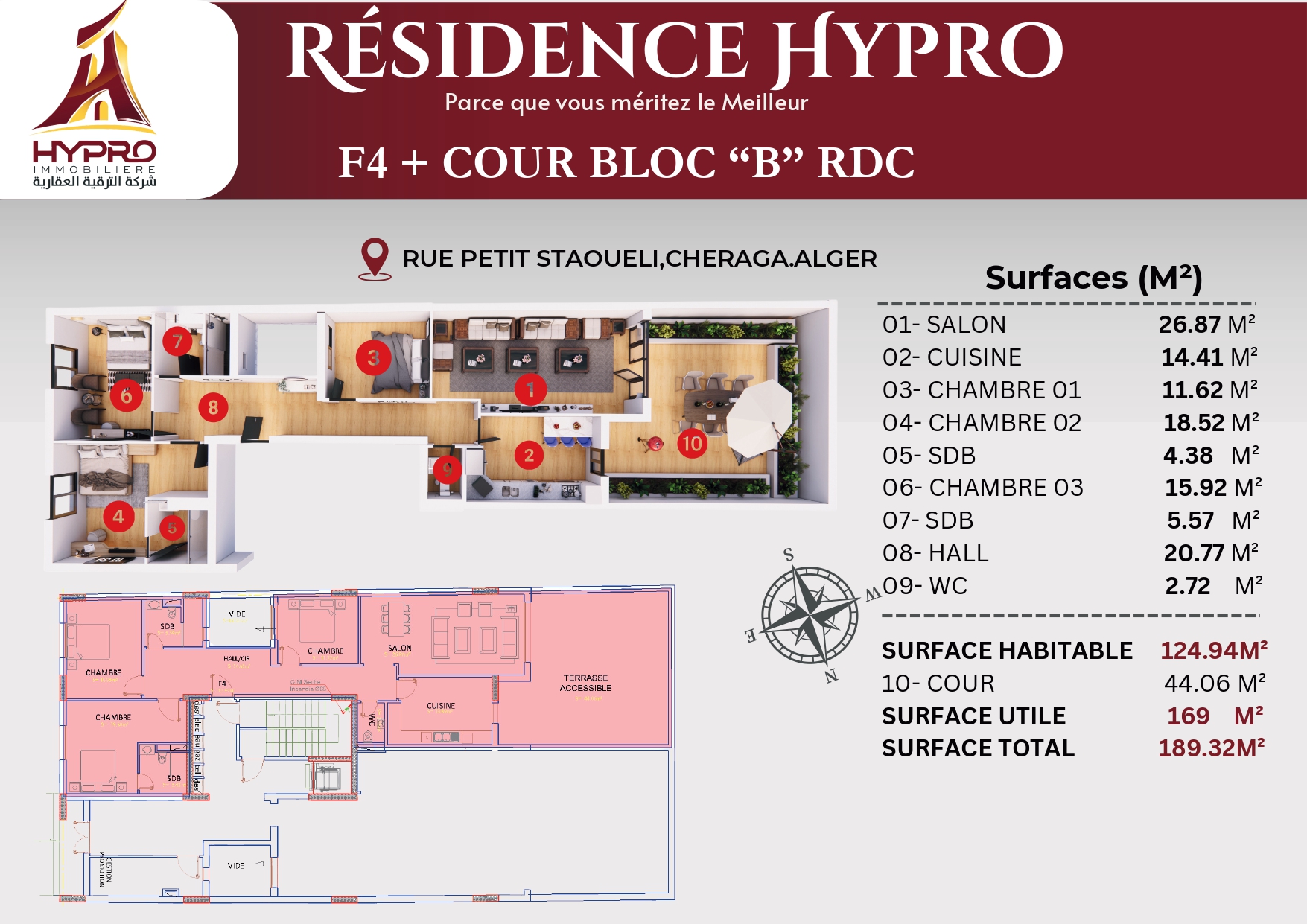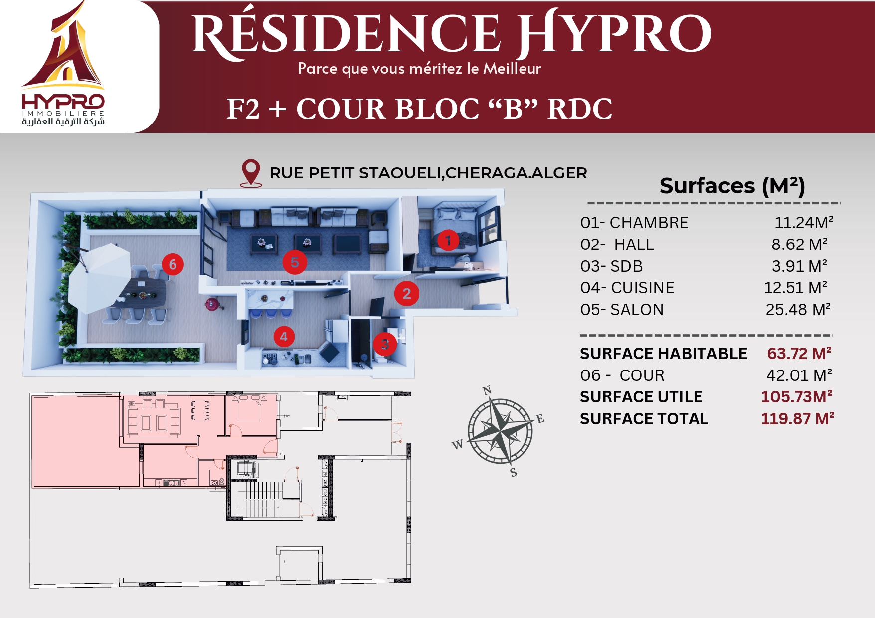 Découvrez une variété d’espaces de vie modernes à la Résidence Hypro, proposant plusieurs configurations d’appartements de 2 à 4 chambres avec des agencements spacieux, des cours privées et des balcons. Offrant une surface habitable allant de 63,72 m² à 124,94 m², ces résidences allient parfaitement confort et praticité, avec des biens conçus aussi bien pour la vie familiale que pour les besoins commerciaux. Chaque unité dispose d’équipements modernes, comprenant plusieurs salles de bains, cuisines, salons et balcons. Située dans le quartier prisé de Petit Staoueli, cette résidence garantit une qualité de vie exceptionnelle.